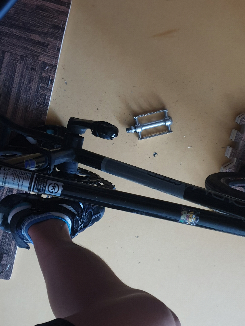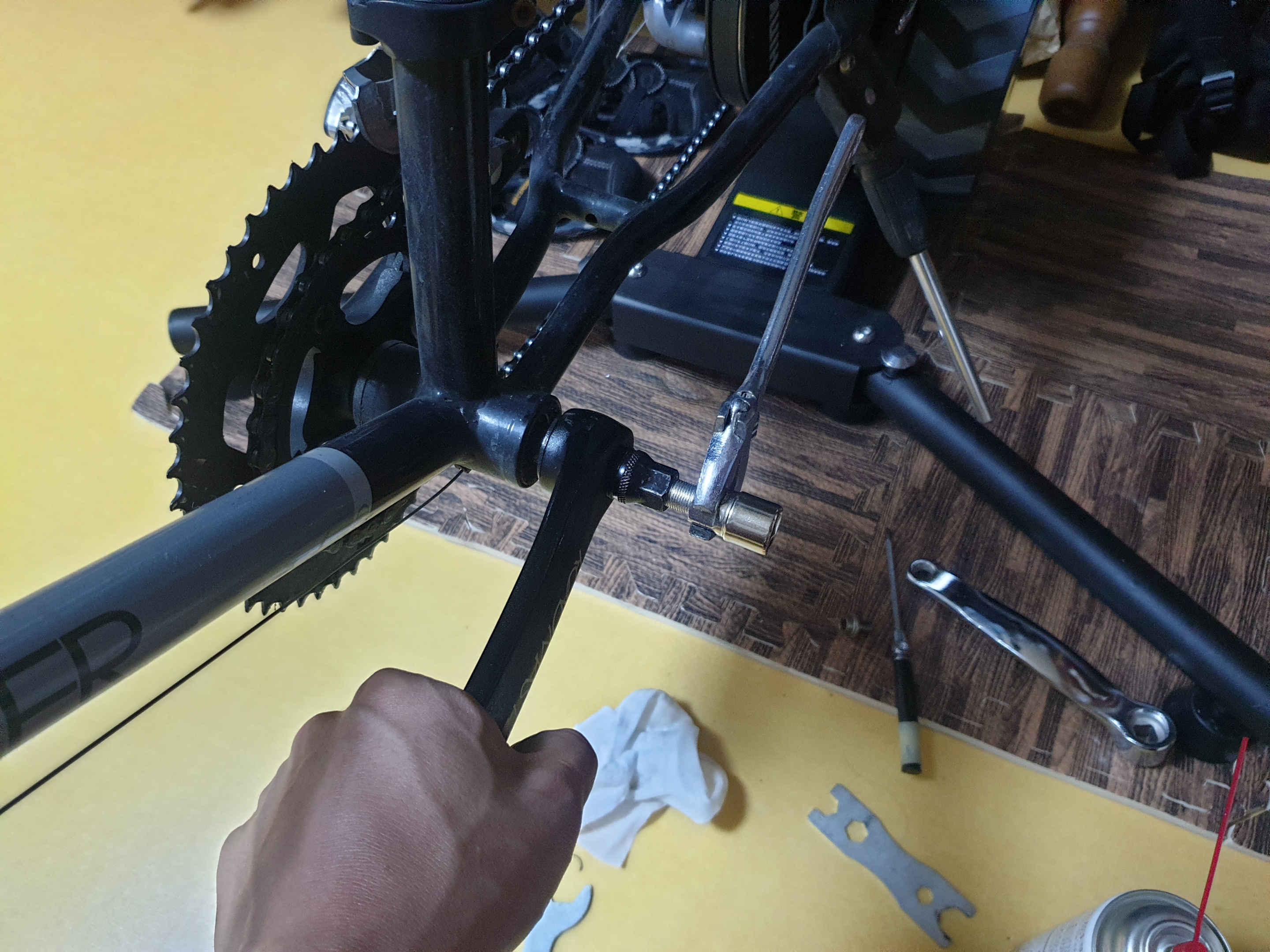 이틀 뒤 크랭크암과 공구가 도착했고 유튜브 검색을 통해 공구 사용법을 익혔다. 엄청 간단했다. 그러나! 크랭크암이 얼마나 세게 박혀 있는지 체중을 다 실어도 꿈적도 하지 않는다. 고착이 심하게 된 것 같았다. WD를 도포해 윤활유가 스며들 시간을 충분히 갖은 다음, 휴식을 취해 악력을 충분히 회복시키고 난 다음에서야 분리에 성공할 수 있었다. 여기까지 2시간 가량 걸린 것 같다.
